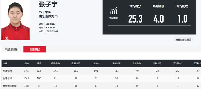 張子宇在本屆賽事已經(jīng)合計出戰(zhàn)4場比賽,合計46中44,且後三場比賽全是百分百準星,僅首場比賽13中11丟瞭兩球。張子宇場均13分鐘能夠得到25.3分4籃板1助攻,4場比賽合計101分,劍指率領山東U18全運女籃奪冠。