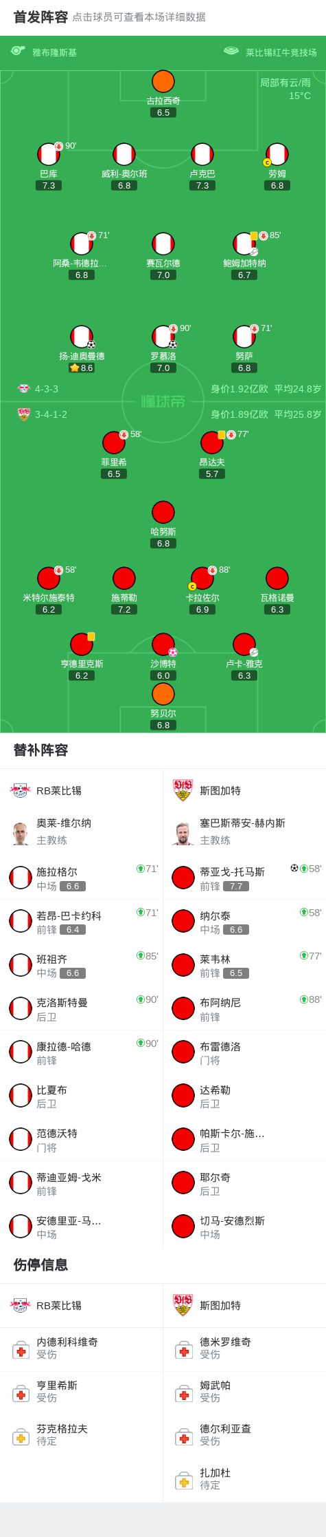 北京時間11月1日,德國足球甲級聯(lián)賽第9輪,RB萊比錫坐鎮(zhèn)主場迎戰(zhàn)斯圖加特。上半場沙博特門前自擺烏龍。下半場迪奧曼德內(nèi)切破門擴大比分,隨后蒂亞戈-托馬斯單刀破門扳回一球,補時階段努貝爾超級低級失誤送禮,羅慕洛破門。最終萊比錫3-1戰(zhàn)勝斯圖加特。
