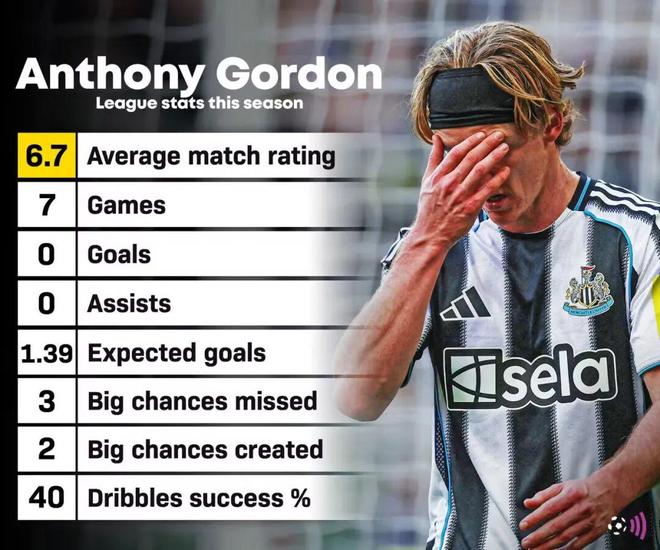 戈登在2023年冬窗從埃弗頓轉(zhuǎn)會(huì)至紐卡斯?fàn)?,初期表現(xiàn)積極,給球隊(duì)帶來了速度和活力。然而,他的終結(jié)能力和決策力一直備受質(zhì)疑。本賽季他的進(jìn)球荒尤其刺眼,尤其是在球隊(duì)急需進(jìn)攻火力的時(shí)候。他在聯(lián)賽中缺乏直接貢獻(xiàn),使得紐卡斯?fàn)柕倪M(jìn)攻效率大打折扣。盡管他在歐冠中展現(xiàn)了不同的面貌,連續(xù)三場比賽都有進(jìn)球,但這反而加劇了外界對(duì)他在英超中“隱身”的質(zhì)疑。