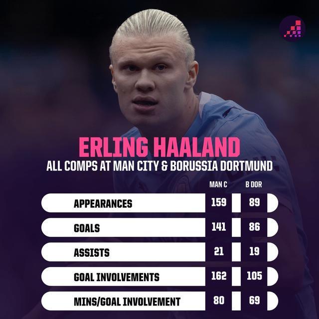 高效!哈蘭德曼城生涯80分鐘參與一球,多特生涯69分鐘造一球
