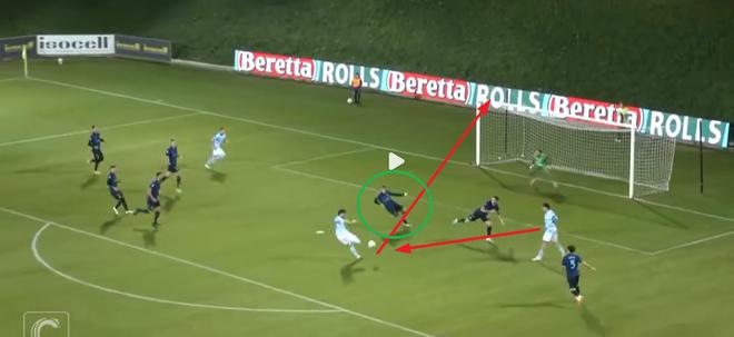 第14分鐘,對手中路大禁區(qū)弧頂處得球,直接起腳重炮轟門,皮球重重擊中橫梁彈出。對手在整個調整+射門的過程當中,隻有亞歷克西烏狂奔五米試圖放鏟封堵——雖然沒堵住,但這種防守態(tài)度,是國米U23非常稀缺的。