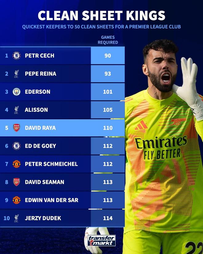 北京時(shí)間11月5日,阿森納在歐冠聯(lián)賽階段第4輪的比賽中客場3-0擊敗瞭佈拉格斯拉維亞,此戰(zhàn)也讓戴維-拉亞達(dá)成瞭自己為槍手零封50場的裡程碑,對此德轉(zhuǎn)則統(tǒng)計(jì)瞭為單一英超俱樂部零封50場所用場次最少的10位門將,切爾西的傳奇門將切赫排名第一,戴維-拉亞位列第五。