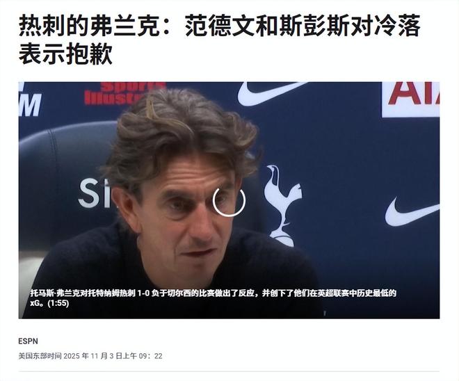 2. 上周六晚間,球隊在自傢主場以0比1不敵切爾西,賽後一幕令人震驚:後衛(wèi)斯彭斯與范德文竟完全忽略主教練弗蘭克伸出的握手致意,直接轉(zhuǎn)身步入球員通道。