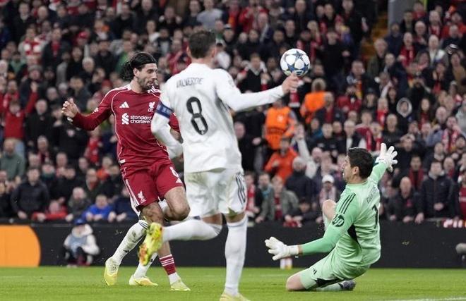 比賽從一開始就進入了利物浦熟悉的快節(jié)奏。上半場,利物浦中場索博斯洛伊便成為皇馬防線的噩夢。他先是機敏包抄搶點,被庫爾圖瓦反應(yīng)神速用腳擋出;隨后又一腳勢大力沉的遠射,再次被這位比利時門神飛身化解。整個上半場,利物浦的進攻一浪高過一浪,而站在他們面前的,仿佛是一堵無法逾越的高墻。