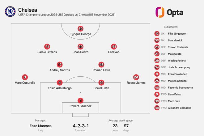 23歲97天,切爾西排出英格蘭球隊(duì)歐冠客場第二年輕的首發(fā)