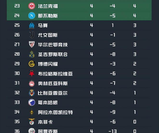 而其他意甲球隊(duì)就沒有那么出色的成績了,亞特蘭大4輪過后7分排在第16,已經(jīng)是僅次于國米之后的最好的成績了。至于上賽季的意甲冠軍那不勒斯,不僅上輪被荷甲的埃因霍溫爆錘了一個(gè)6:2,而且4輪4分排在第24,卡在附加賽的區(qū)域。而尤文圖斯4輪過后更是沒有獲勝,第26名位列淘汰賽。