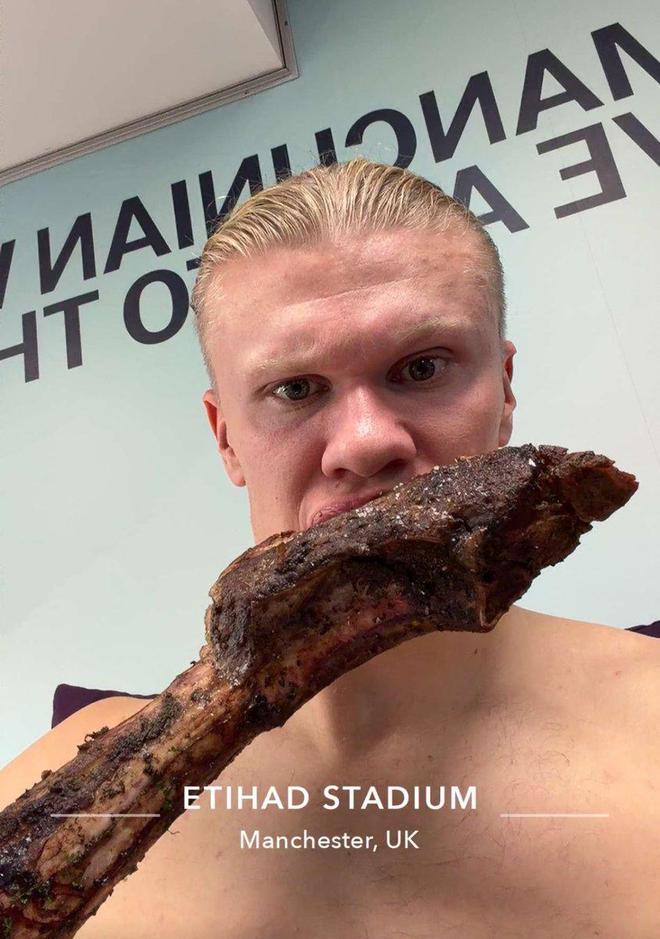 比賽結(jié)束後,哈蘭德在社交媒體上曬出瞭自己在更衣室吃羊排的照片。