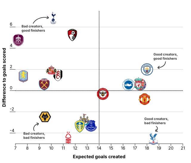 熱刺球迷懷念波斯特科格魯時代的進(jìn)攻自由,但他因防守糟糕而被解雇。弗蘭克被視為能平衡攻防的繼任者,以戰(zhàn)術(shù)智慧和球員培養(yǎng)能力著稱。然而,如今的熱刺似乎又陷入同樣的困局,隻是這一次沒有瞭前主席丹尼爾-列維,新的管理層如何應(yīng)對仍不明確。數(shù)據(jù)也對弗蘭克不利。熱刺本賽季進(jìn)球數(shù)比預(yù)期高出七球,是英超超額表現(xiàn)最高的球隊(duì)之一。這意味著他們創(chuàng)造機(jī)會有限,隻是依靠高效終結(jié)撐場。雖然俱樂部10月註入1億英鎊資金,但支出仍無法與頂級豪門匹敵。