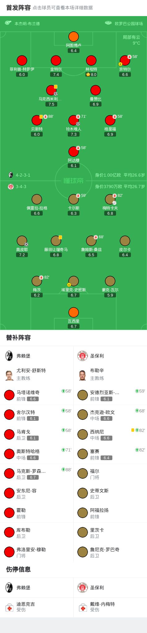 弗賴堡2-1圣保利,馬克西米利安-埃格施泰因、鈴木唯人破門