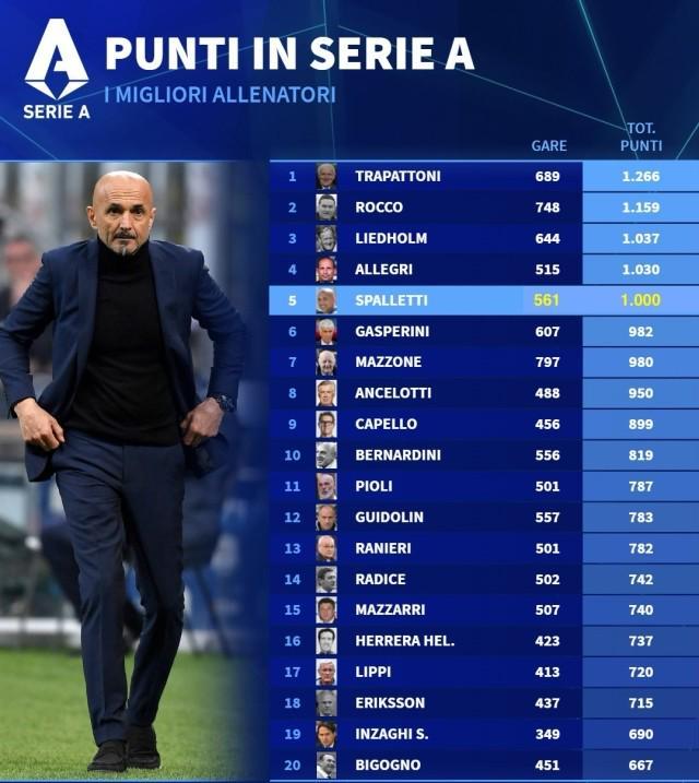 尤文0比0都靈,憑借這場(chǎng)平局,斯帕萊蒂拿到執(zhí)教生涯意甲第1000分,成為特拉帕托尼、羅科、利德霍爾姆和阿萊格裡之後,第5位在意甲中達(dá)到 1000 分裡程碑的教練(勝場(chǎng)按3分計(jì)算,對(duì)手棄權(quán)算勝)。 在這561場(chǎng)意甲比賽中,斯帕萊蒂先後帶領(lǐng)恩波利(34場(chǎng)37分)、桑普多利亞(28場(chǎng)34分)、威尼斯(17場(chǎng)15分)、烏迪內(nèi)斯(117場(chǎng)178分)、羅馬(211場(chǎng)422分)、國(guó)際米蘭(76場(chǎng)141分)、那不勒斯(76場(chǎng)169分)和尤文圖斯(2場(chǎng)4分),取得瞭289勝133平139負(fù)的戰(zhàn)績(jī)。