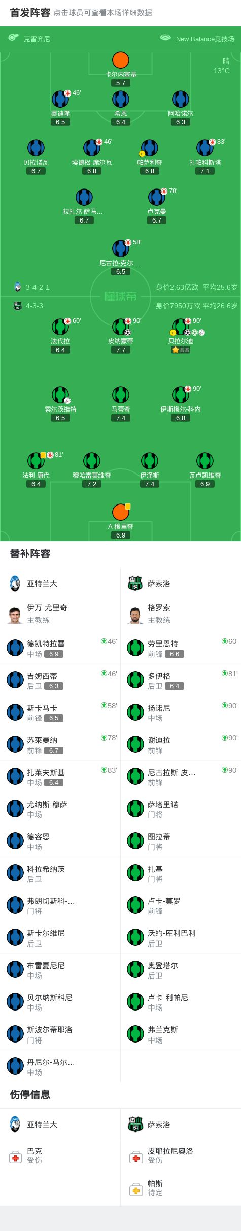 第67分鐘,貝拉爾迪單刀破門完成雙響,薩索洛3-0亞特蘭大