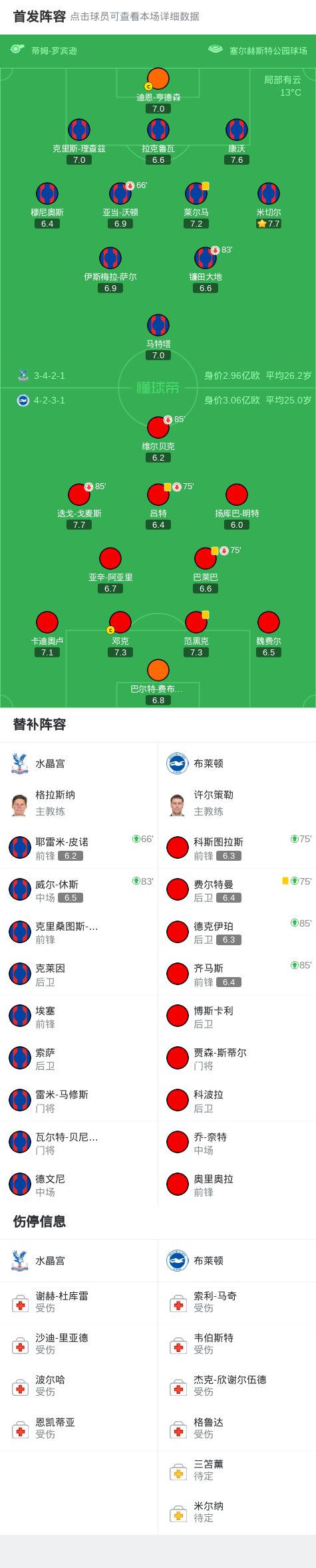 水晶宮0-0佈萊頓,薩爾、皮諾射門造險,呂特假摔染黃