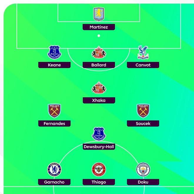 中場:紮卡(桑德蘭)、馬特烏斯-費爾南德斯(西漢姆聯(lián))、紹切克(西漢姆聯(lián))、迪尤斯伯裡-霍爾(埃弗頓)
