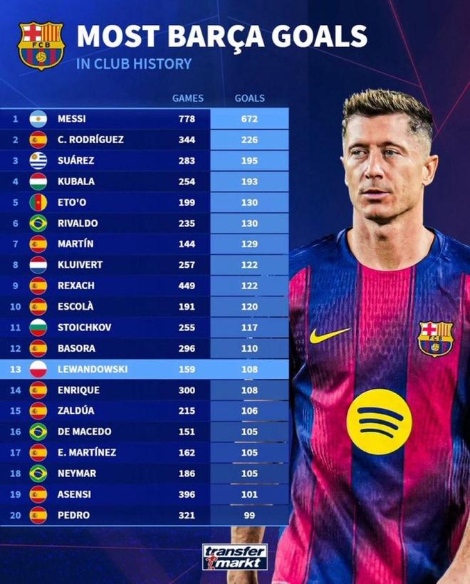 北京時間11月11日,在萊萬多夫斯基用帽子戲法幫助巴塞羅那客場4-2戰(zhàn)勝塞爾塔之后,德轉(zhuǎn)列出了巴薩隊史射手榜排名前20的球員,梅西斷崖式領(lǐng)先,萊萬以108球與路易斯-恩里克并列第14位。