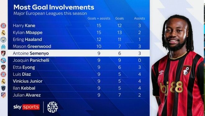 塞梅尼奧(伯恩茅斯)9(6球3助)