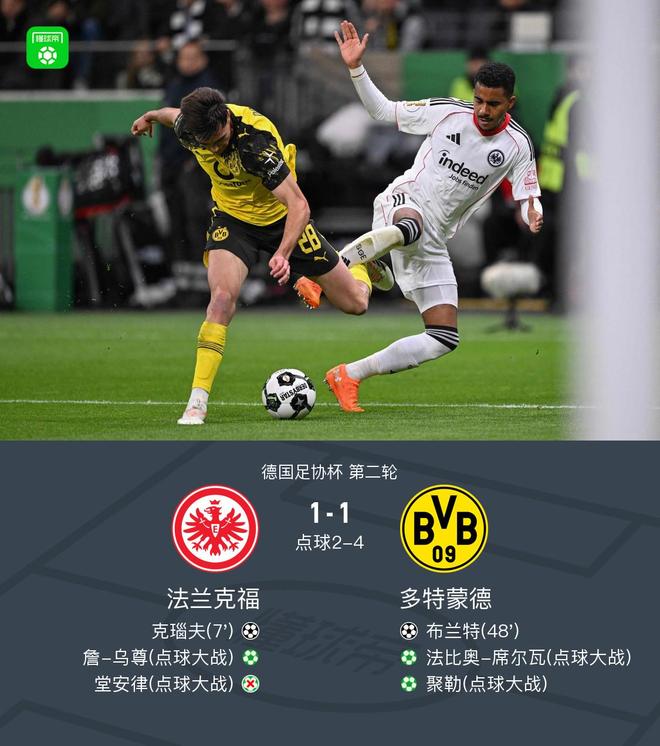 點球大戰(zhàn)多特4-2法蘭克福,總比分5-3晉級