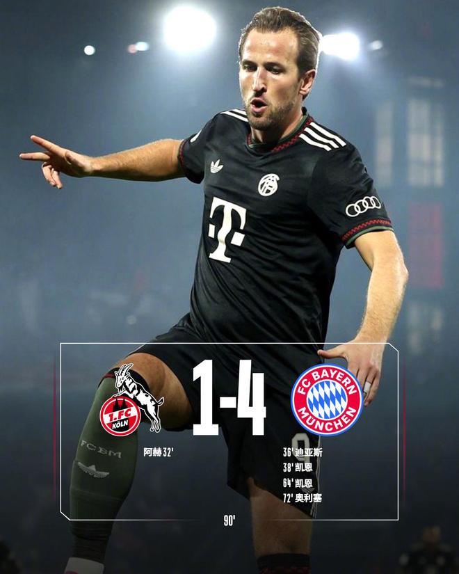 這場比賽率先進(jìn)球的是科隆。依靠一次角球機(jī)會,阿赫頭球頂進(jìn)。不過,只過了5分鐘,拜仁就扳平了比分。路易斯-迪亞斯在禁區(qū)內(nèi)補(bǔ)射破門。第40分鐘,拜仁反超比分。哈里-凱恩在角度極小的情況下轉(zhuǎn)身射門打進(jìn),難度極高。下半場哈里-凱恩再接再厲,頭球頂進(jìn),梅開二度。隨后,奧利塞進(jìn)球擴(kuò)大比分,徹底殺死比賽。最終的比分定格為4-1,拜仁淘汰科隆。